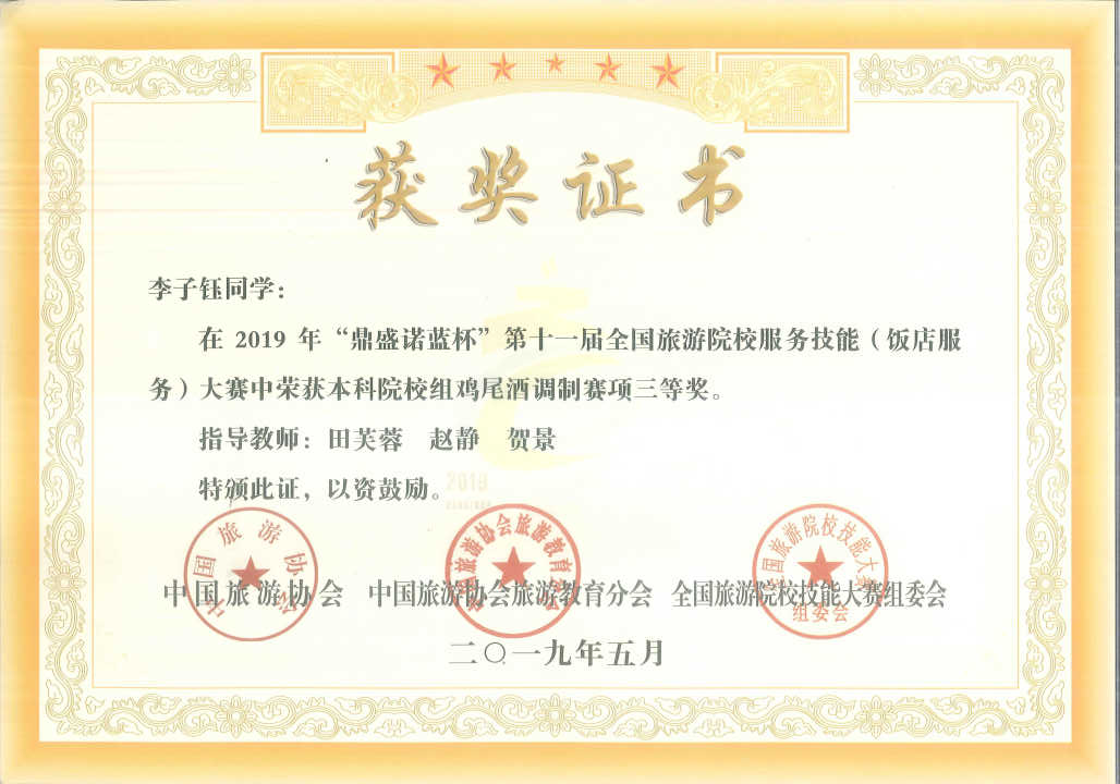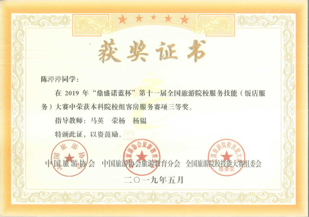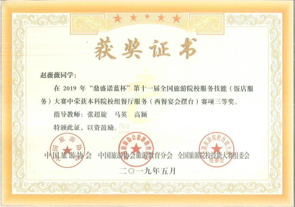 5月16日-19日, 2019年“鼎盛诺蓝杯”第十一届全国旅游院校服务技能(饭店服务)大赛在杭州举办,公司威廉希尔williamhill陈渟渟、李子钰、章粤东、赵薇薇四名参赛选手均荣获本科院校组三等奖。陈渟渟同学荣获客房服务赛项三等奖,李子钰同学荣获鸡尾酒调制赛项三等奖,章粤东同学荣获餐厅服务(中餐宴会摆台)赛项三等奖,赵薇薇同学荣获餐厅服务(西餐宴会摆台)赛项三等奖。