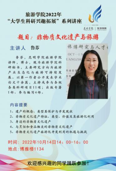 为丰富公司同学们学习生活,活跃同学们科研学术氛围、提高同学们学术活动的兴趣和积极性,从本学期开始,威廉希尔williamhill科研办和团委联合举办“老员工科研拓展”活动系列讲座。2022年10月14日下午14:00-16:00公司举办第一次讲座,讲座邀请公司科研办鲁芬老师跟同学们分享“非物质文化遗产与旅游”话题。