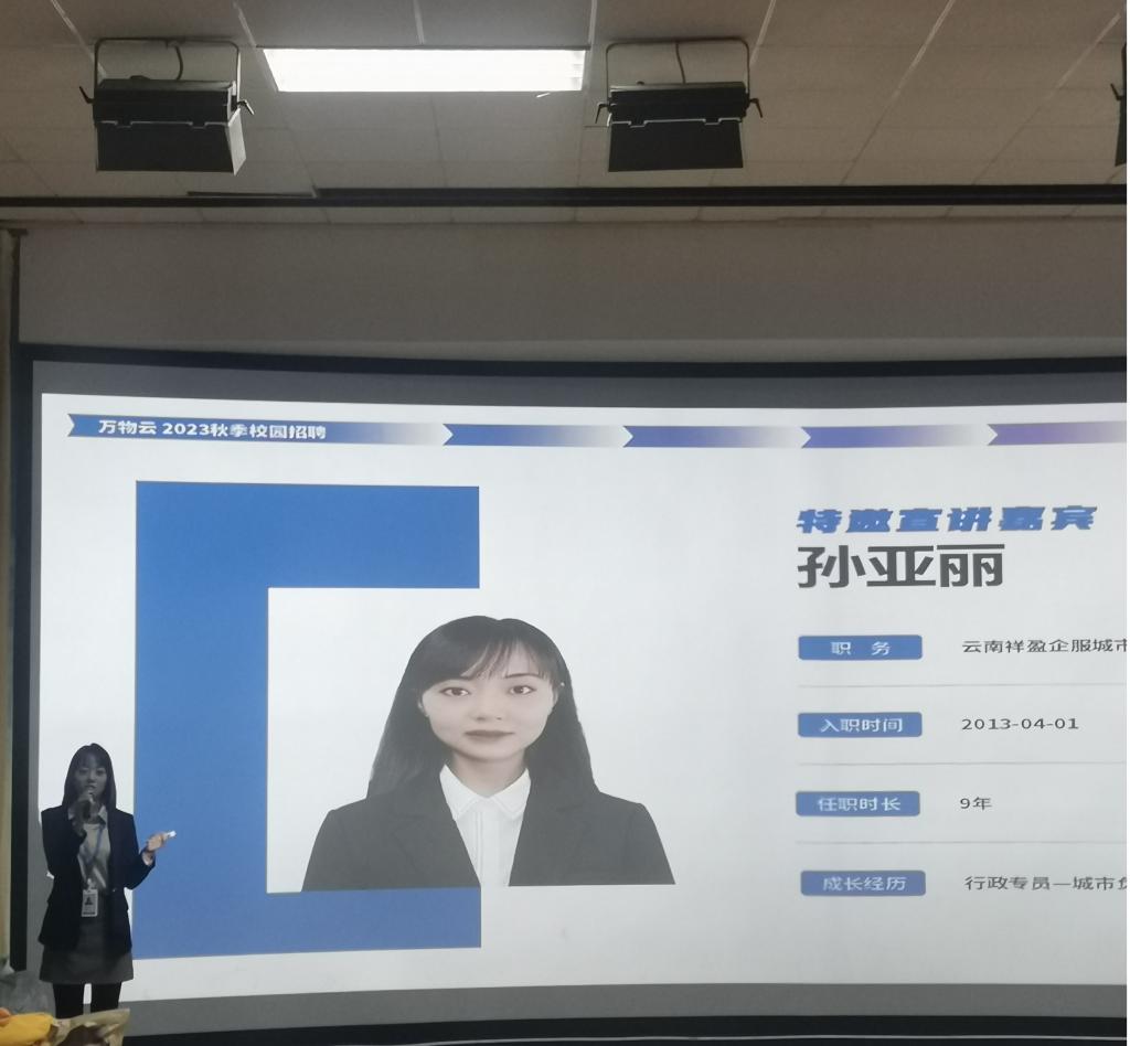 万科物业昆明城市中心负责人孙亚丽针对目前万科物业企业发展现状、人才培养机制、招聘计划、员工薪酬结构等作了详细的介绍。威廉希尔williamhill2022届旅游管理专业毕业生吴迪以万科物业员工的身份和学弟、学妹们分享了就业体验。