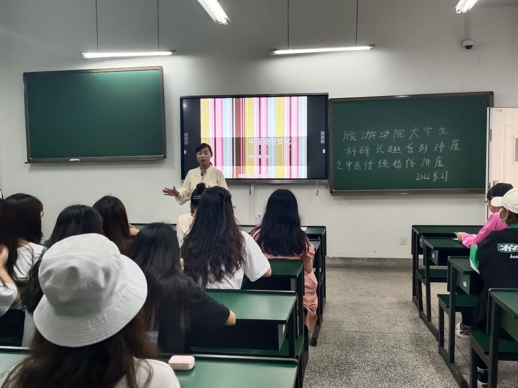 张欣老师为同学们介绍了婚姻的起源与发展,介绍了三书六礼,讲解了著名影视剧中的文化错误,对周、唐、宋、明、清不同朝代的婚礼特点一一为同学们作详细讲解。张欣老师的讲解幽默风趣,同学们积极配合,讲座气氛融洽。