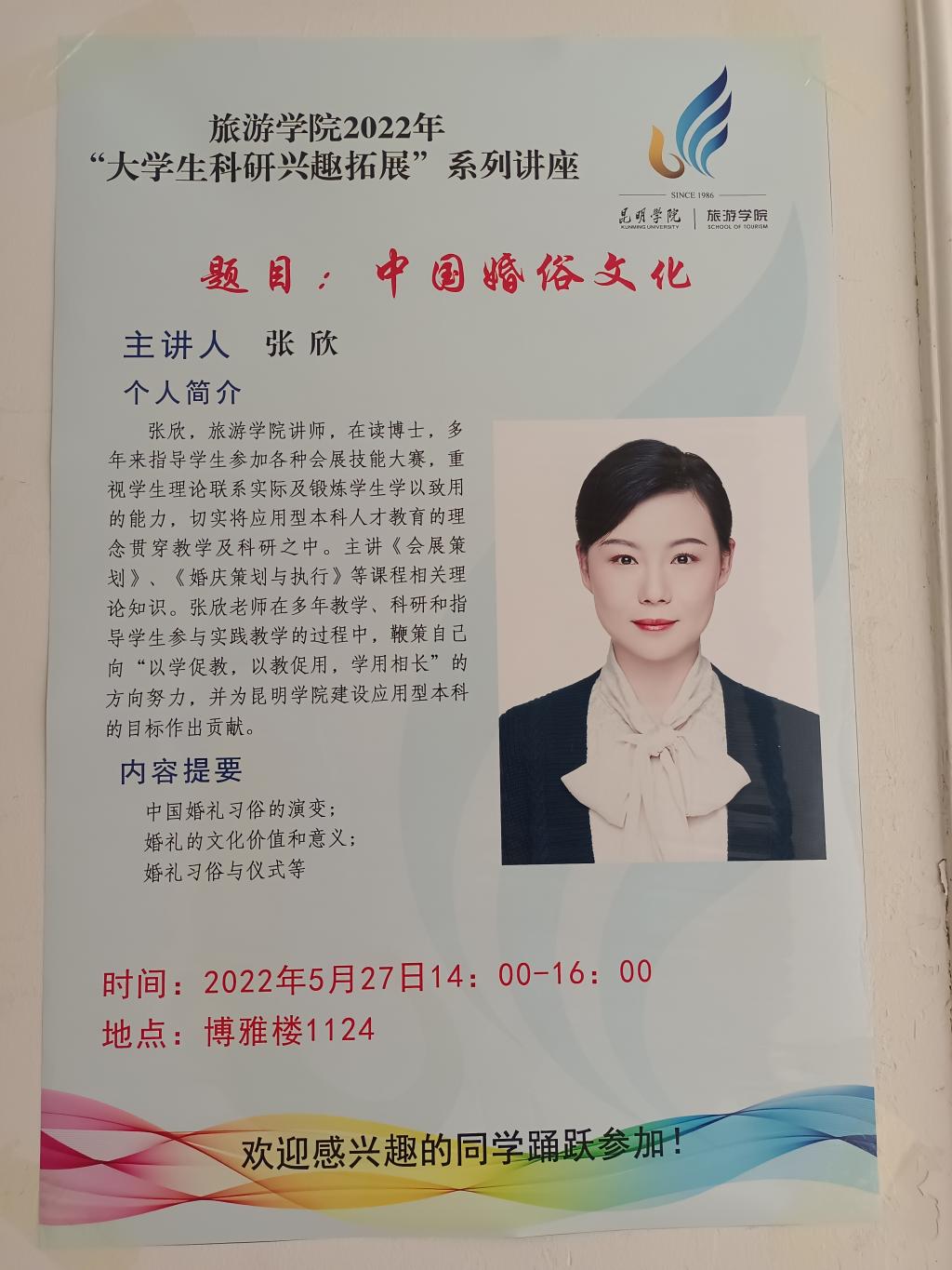 2022年5月27日下午14:00-16:00,威廉希尔williamhill在博雅楼1124教室,举办老员工科研兴趣拓展系列第三讲——中国传统婚俗文化,讲座由威廉希尔williamhill张欣老师主讲。