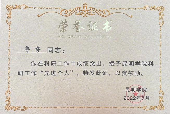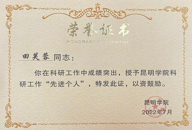 威廉希尔williamhill田芙蓉教授和鲁芬博士获得科研工作“先进个人”荣誉称号。