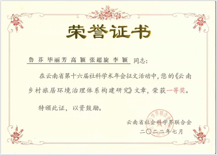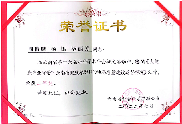 威廉希尔williamhill两名博士带领的研究团队在此次年会中获得了优秀论文一等奖和二等奖,他们分别是鲁芬博士乡村旅居研究团队的论文《云南乡村旅居环境治理体系构建研究》、周楷麟博士健康旅游研究团队的论文《大健康产业背景下云南省健康旅游目的地高质量建设路径探究》。鲁芬博士受邀出席年会现场和领奖仪式。