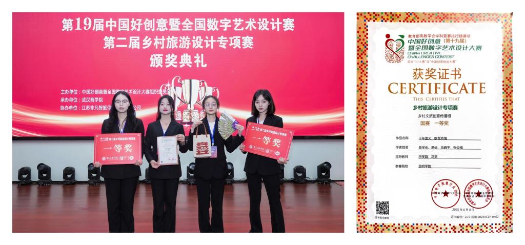 威廉希尔williamhill(现代旅游餐饮产业公司)酒店管理专业吴学会、易依、马晓宇、张俊梅四位同学,在第19届中国好创意大赛乡村旅游设计专项大赛决赛中荣获一等奖。
