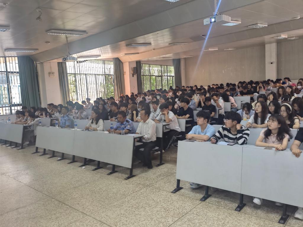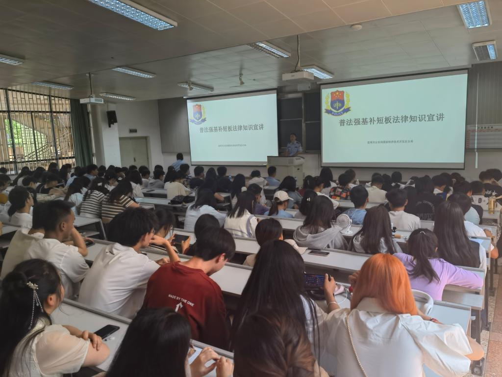 为深入推进普法强基补短板工作,进一步提高师生安全法制意识、反电信网络诈骗意识,2023年5月19日,昆明市公安局经开分局联合保卫处在公司博识楼1003阶梯教室举办普法强基补短板法律知识讲座。昆明市公安局经开分局昌宏路派出所副所长李学再、经开公安分局刑侦大队警官罗一航、昌宏路派出所警官符桐熒,公司保卫处副处长张智益、旅游公司党委副书记喻玲、威廉希尔williamhill师生及各二级公司员工代表共300余名参加讲座。