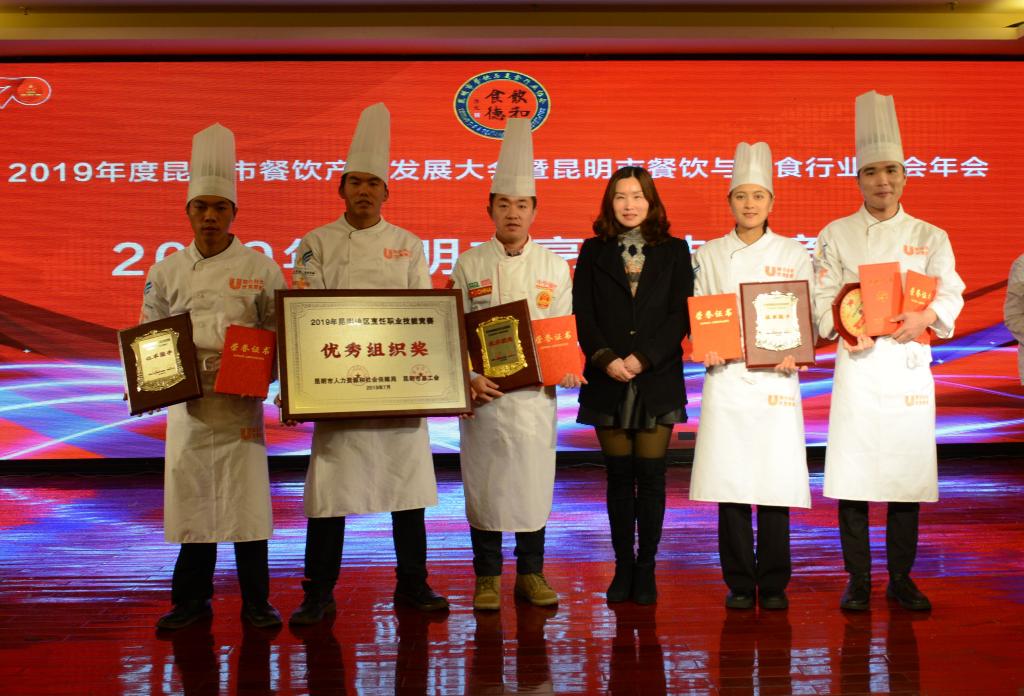 威廉希尔williamhill委派王勇大师、刘福灿大师组建代表队并指导师生参赛。在公司、公司院领导的鼎力支持与配合下,参赛选手不负厚望,取得优异成绩:威廉希尔williamhill荣获昆明市人力资源和社会保障局与昆明市总工会颁发的优秀组织奖;代表队参赛选手共获奖牌4枚,荣誉证书5份,是威廉希尔williamhill历年来参赛率、得奖率与含金量较大的一次参加赛事。其中刘福灿大师荣获特色民族菜第一名授予昆明市技术状元称号、昆明市厨师榜样人物及5000元现金奖励,并获得申报昆明市五一劳动奖章资格,将在2020年初申报此奖项;陈达标同学荣获优秀技术能手称号及2000元现金奖励;张智翔、冯娟娟两位同分别荣获技术能手称号及各得1000元现金奖励成绩。