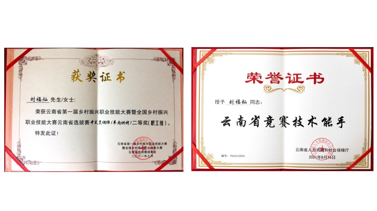 经过3天的比拼,公司高技能人才引进刘福灿技能大师和烹饪本科班刘桂明员工从132名选手中脱颖而出喜获佳绩,获得“二等奖”成绩,被授予“云南竞赛技术能手”荣誉称。